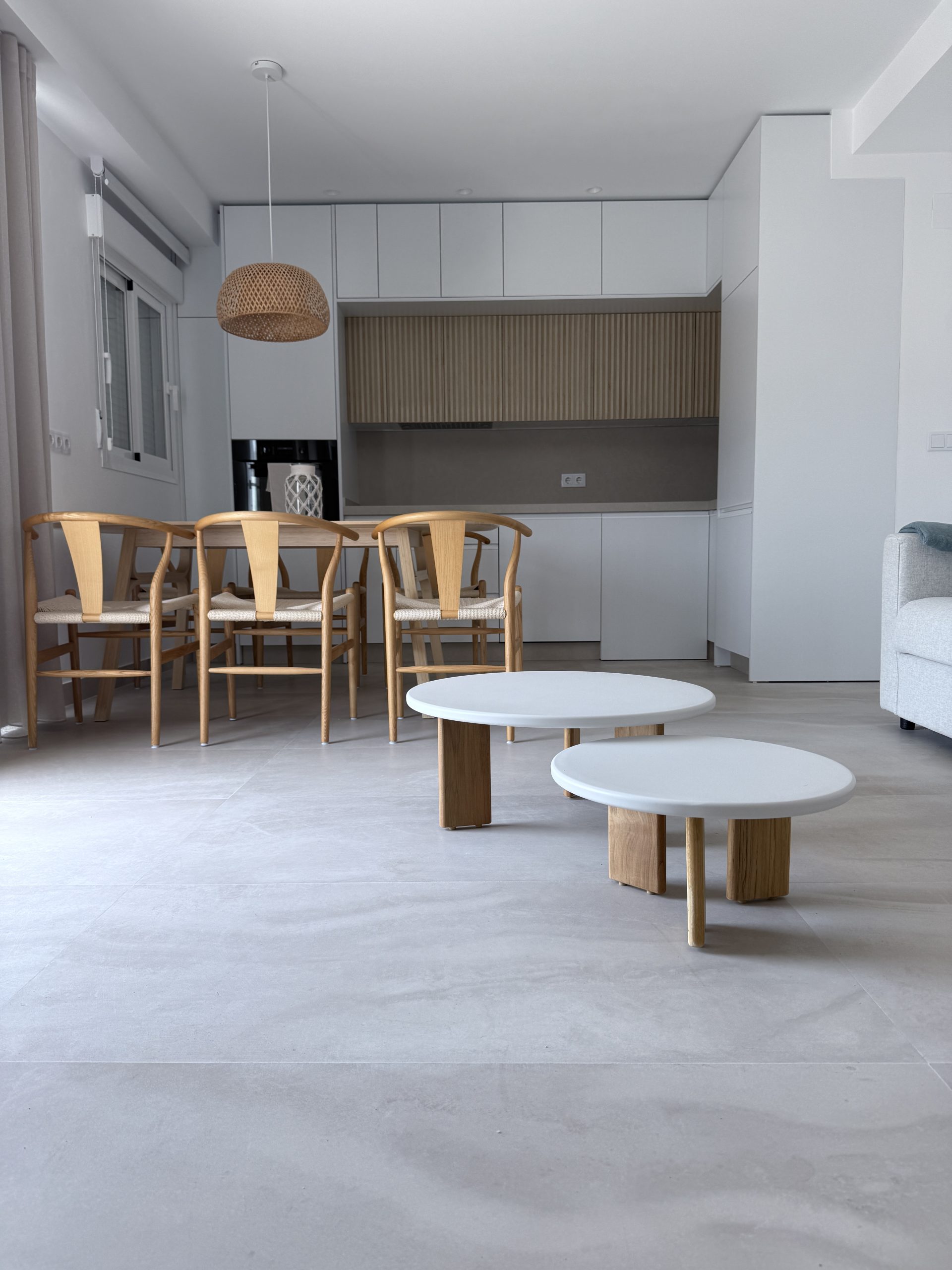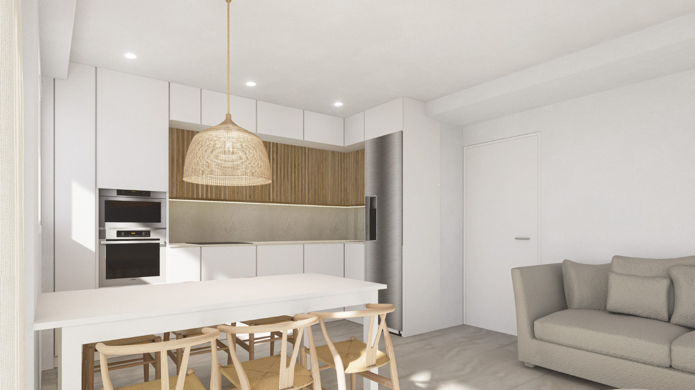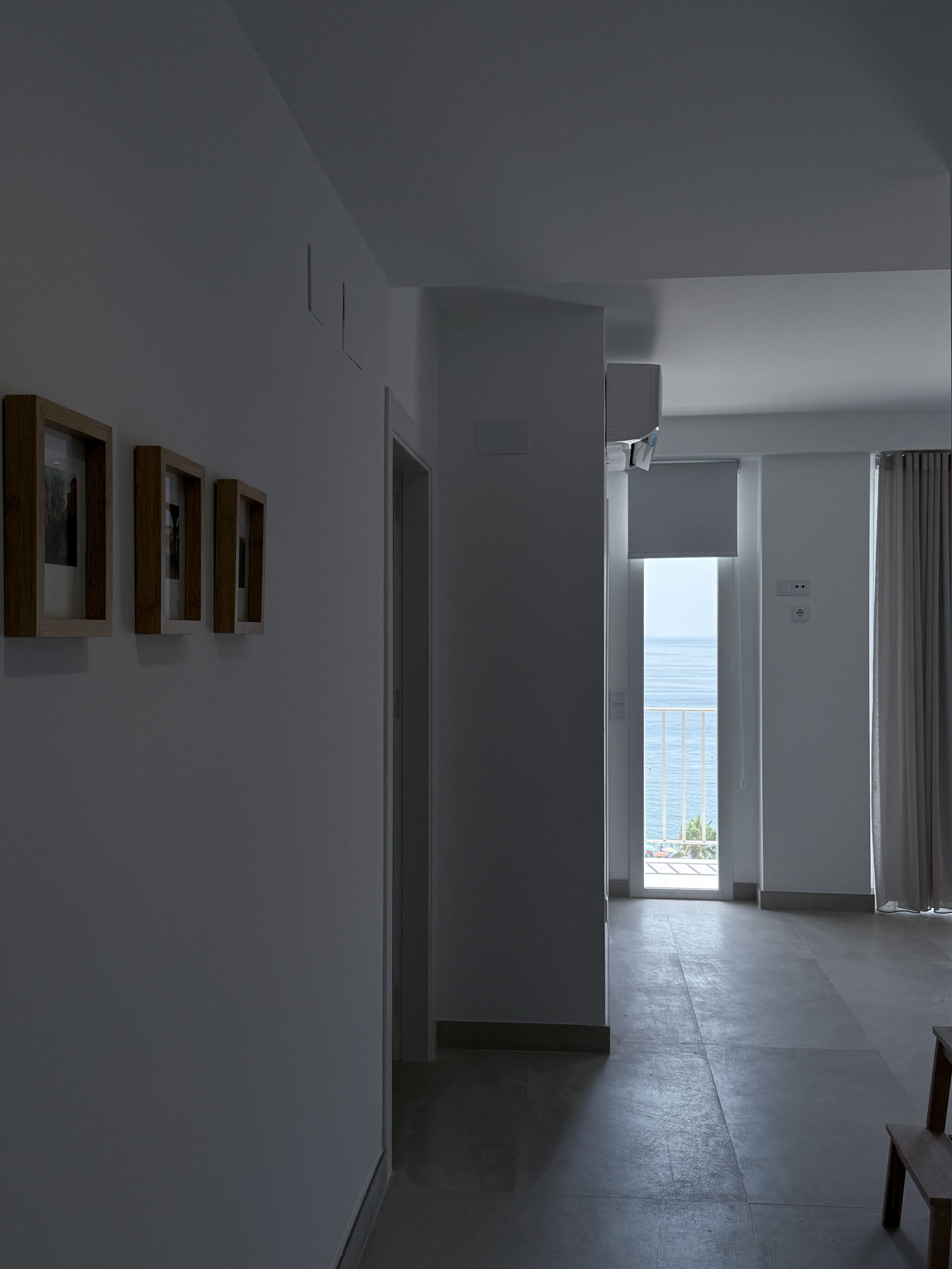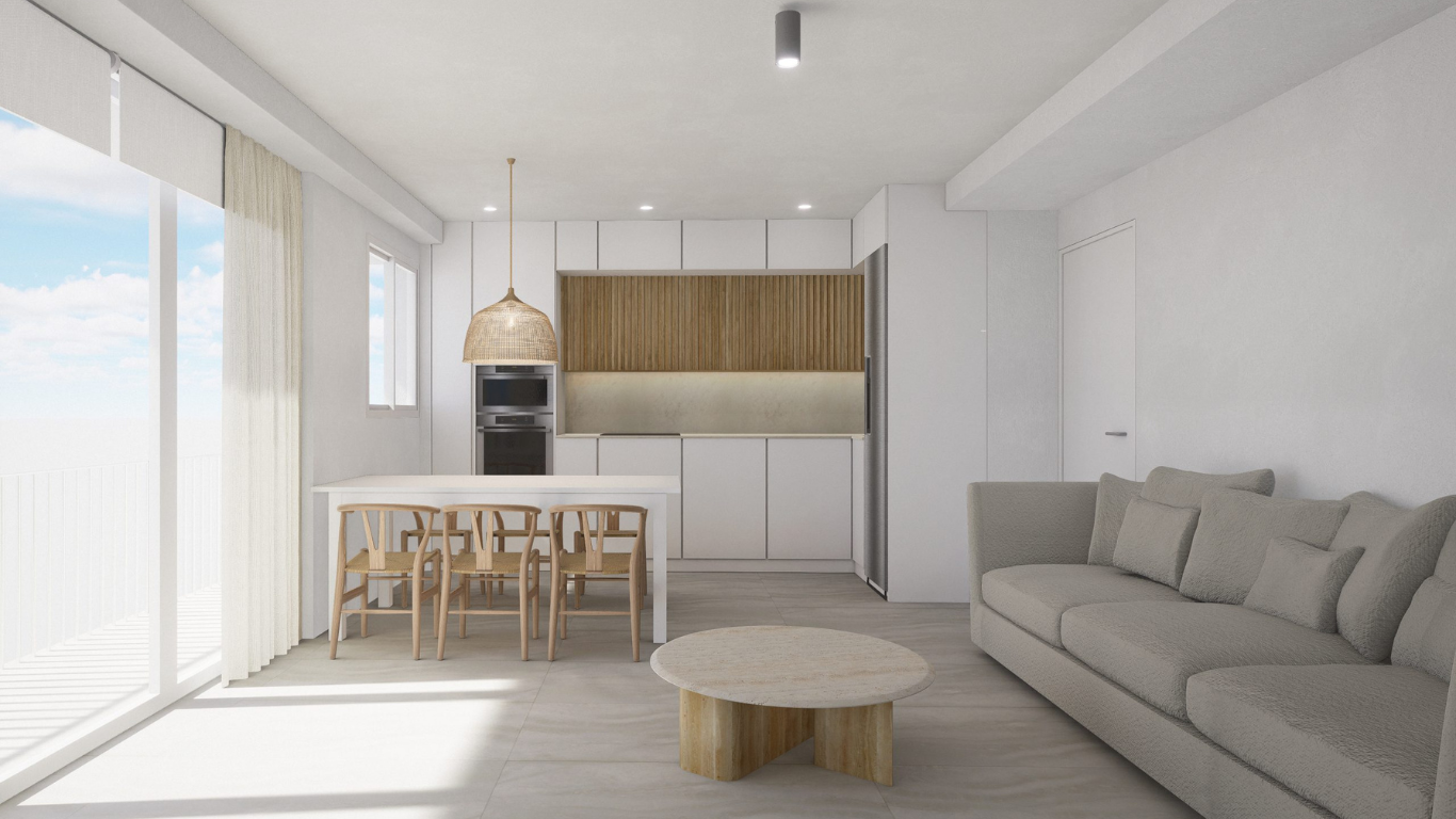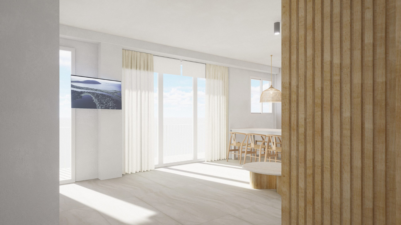 Reformar una vivienda situada frente al mar en un edificio con más de 50 años de antigüedad, realizando un diseño que responda a las necesidades del cliente y a un diseño mediterráneo acorde con la ubicación del mismo. Mejoramos la eficiencia de la vivienda colocando aislamiento térmico y acústico en fachada y tabiques medianeros, instalamos ventanas con doble acristalamiento y protección acústica y térmica consiguiendo así una mayor hermeticidad. En cuanto al diseño optamos por materiales de calidad superior que nos garanticen una gran durabilidad teniendo en cuenta que nos ubicamos justamente en frente del mar. Aprovechamos las vistas al mar para generar ventanas de suelo a techo que den mayor amplitud a la vivienda, consiguiendo un espacio luminoso y relajante.