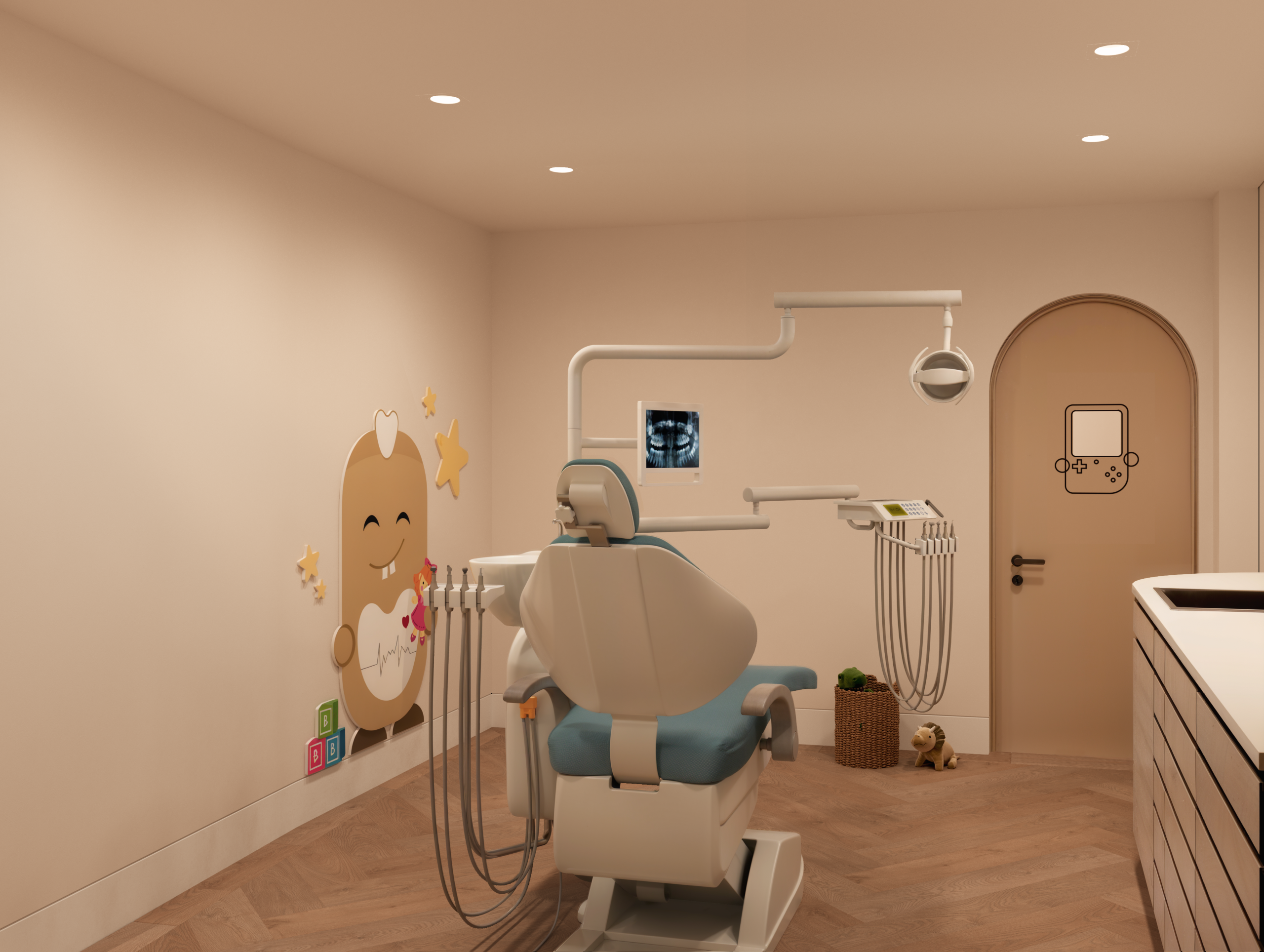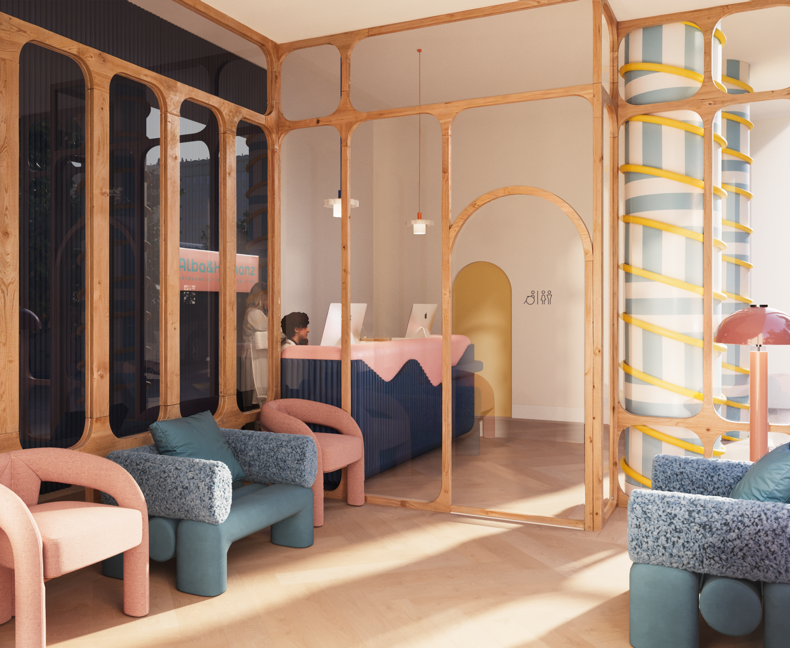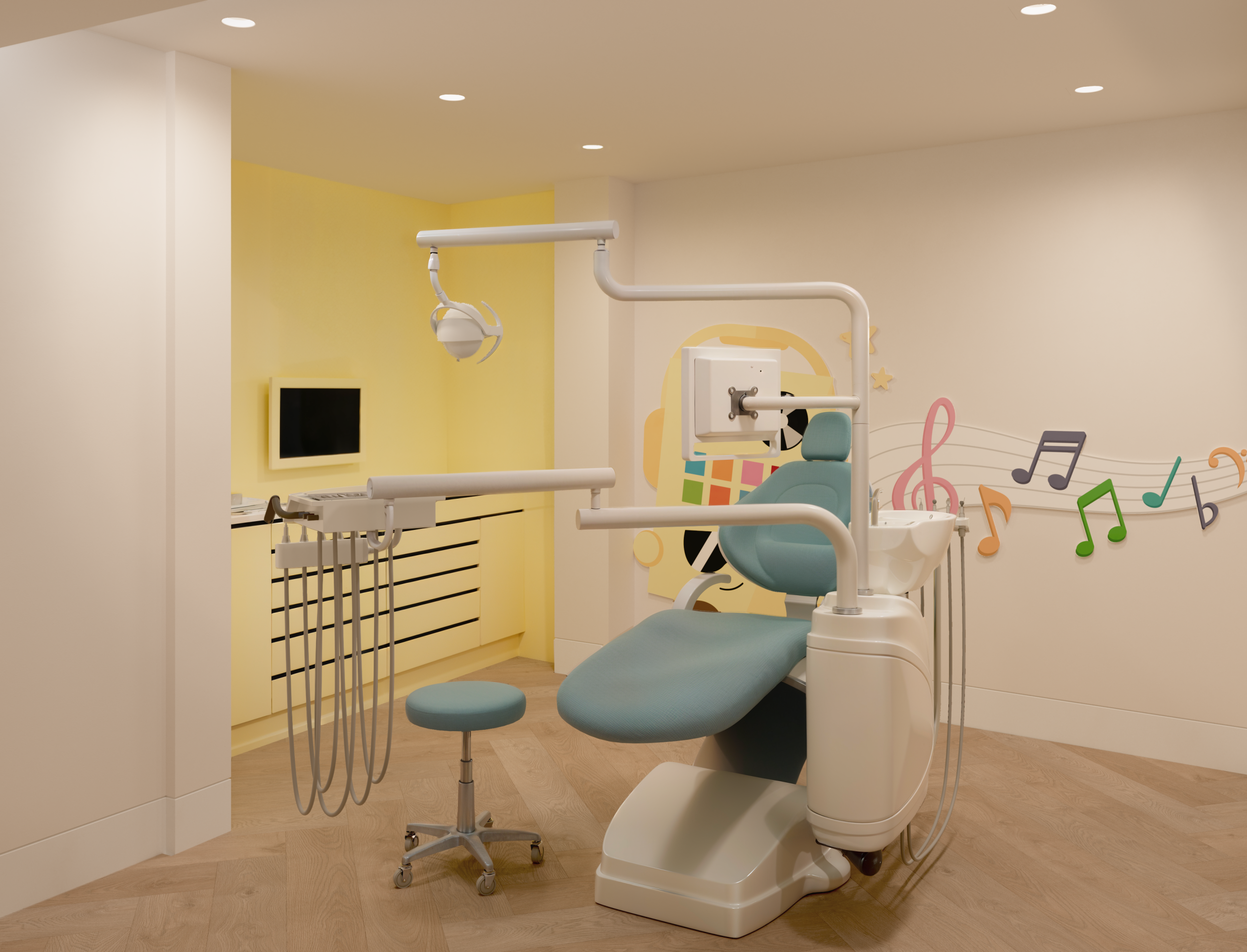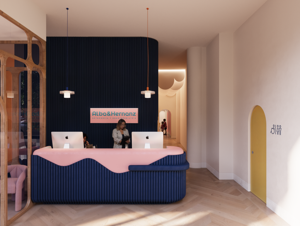 El proyecto se centró en crear una clínica dental infantil en Granada pensada para mejorar la experiencia del paciente más pequeño. La sala de espera se diseñó con diferentes zonas animadas que generan un ambiente acogedor y lúdico. Los aseos coloridos y los gabinetes odontológicos temáticos se concibieron como espacios funcionales y divertidos, donde el niño se sienta seguro y motivado.