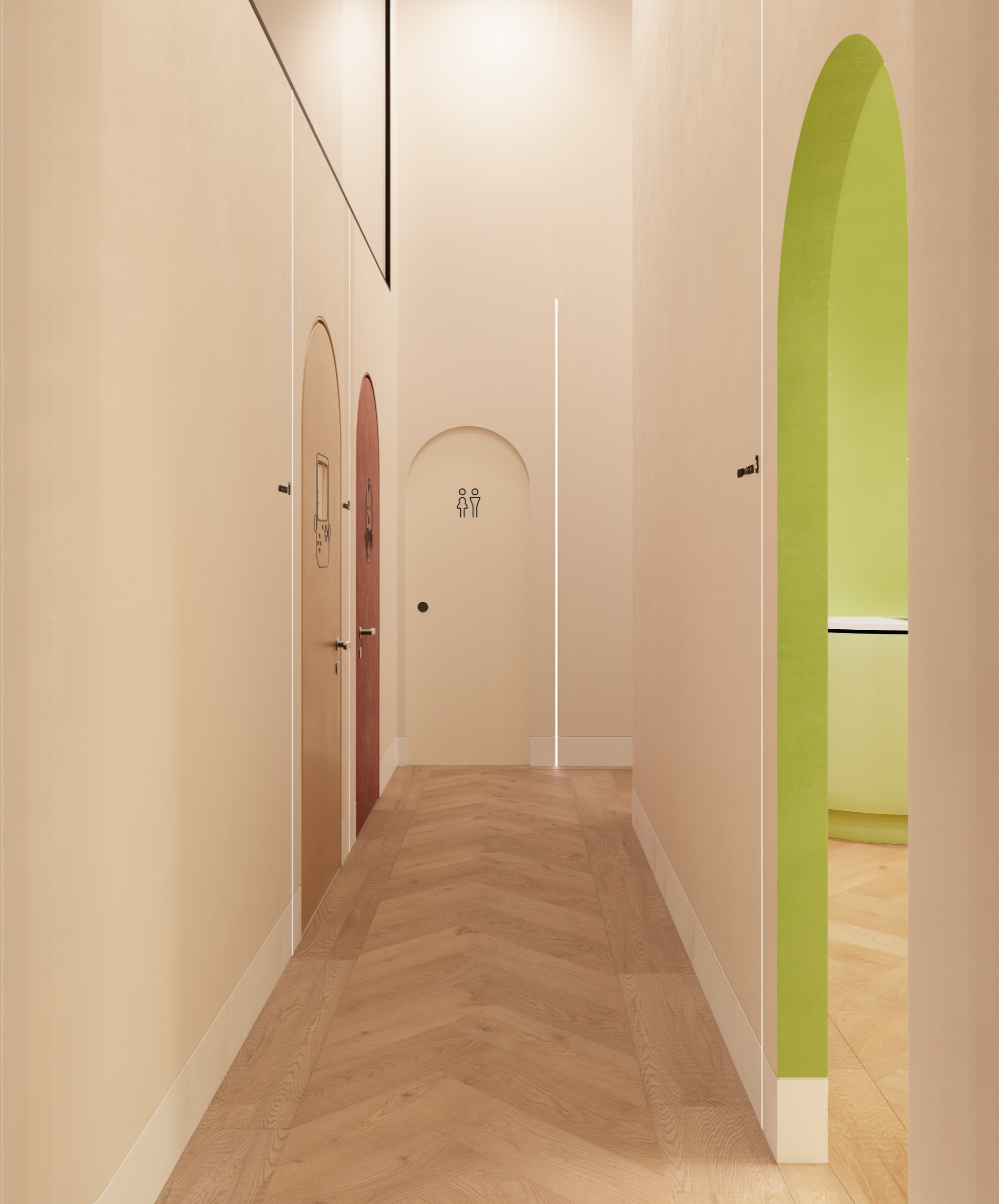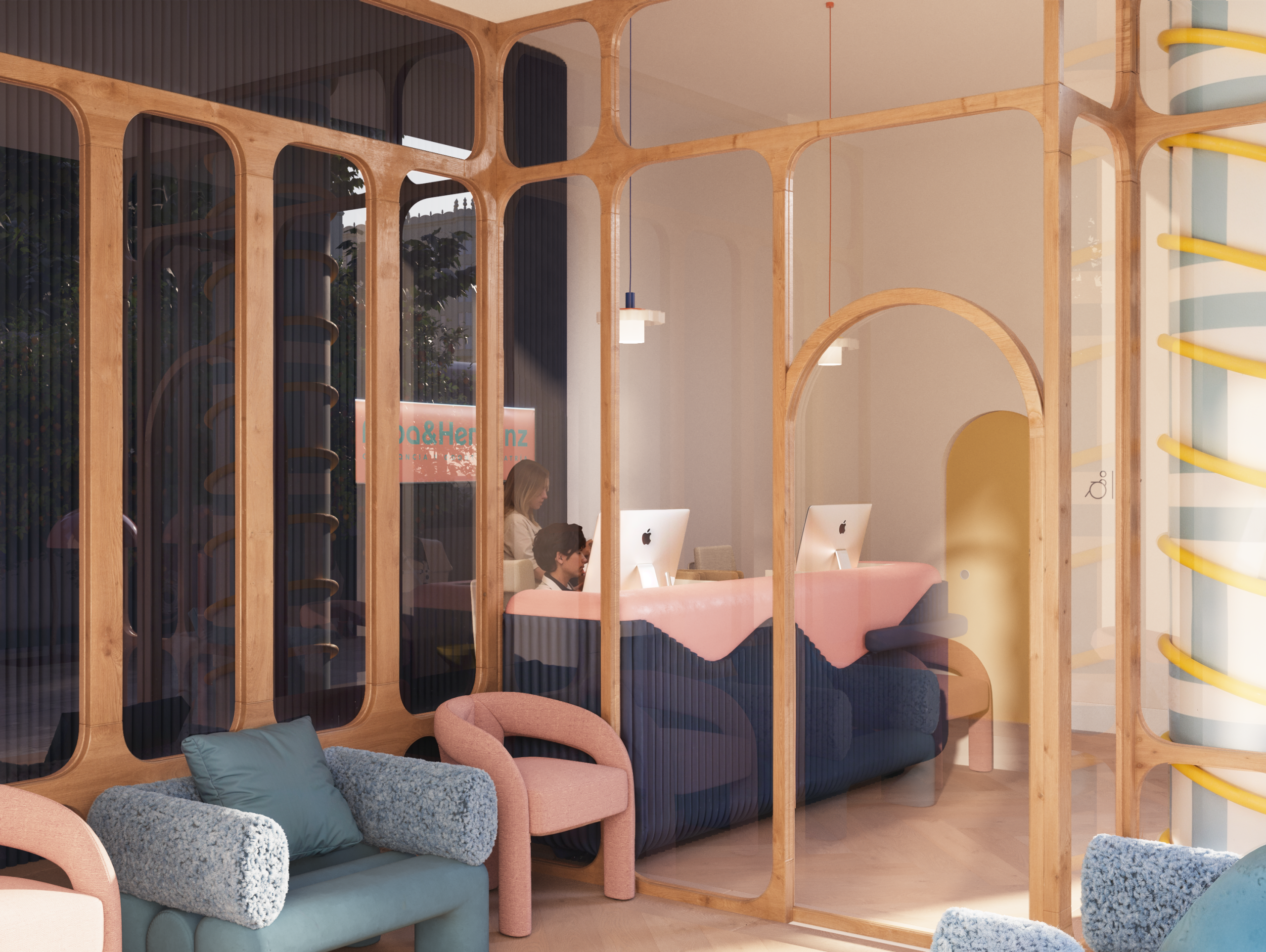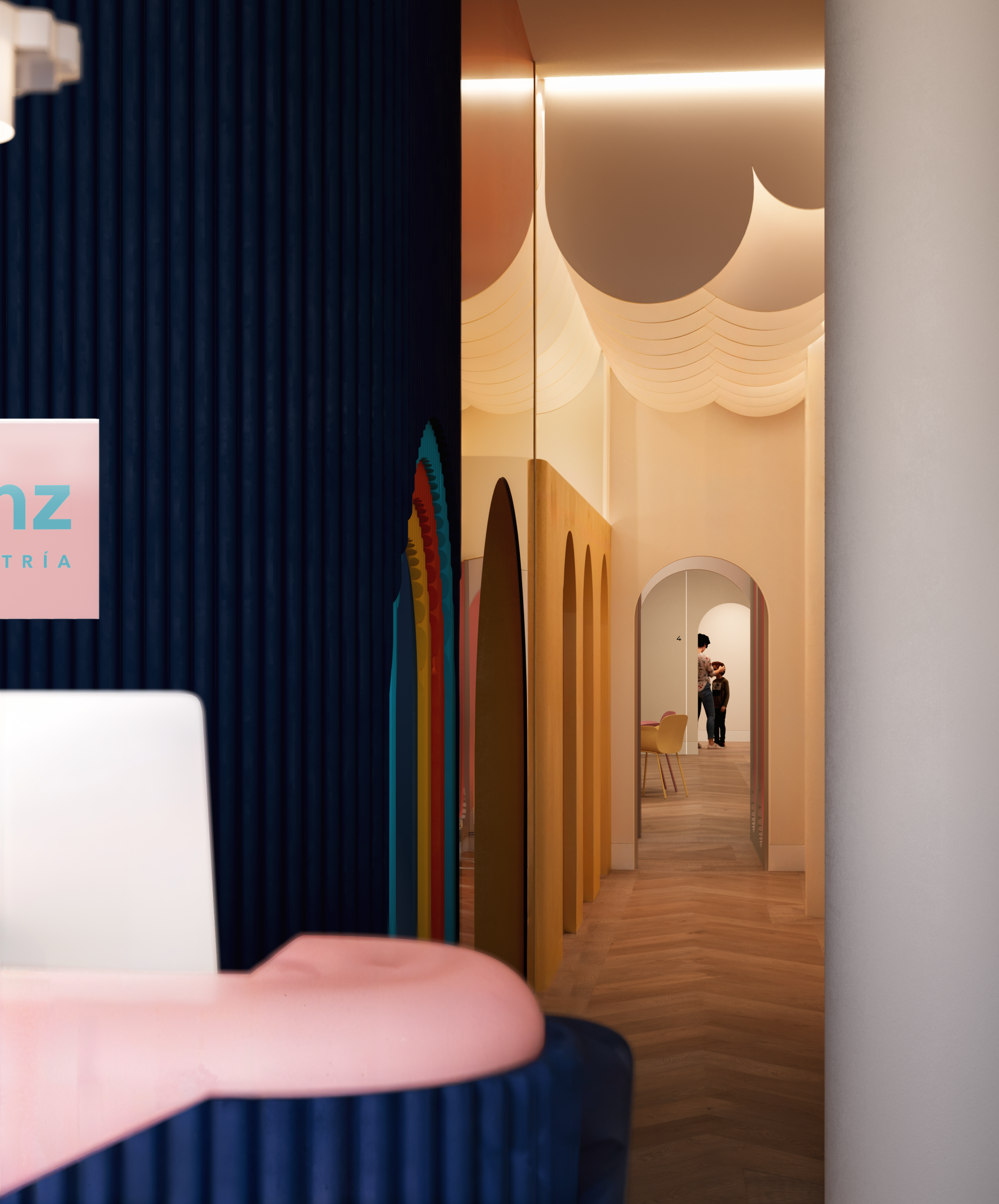 El proyecto se centró en crear una clínica dental infantil en Granada pensada para mejorar la experiencia del paciente más pequeño. La sala de espera se diseñó con diferentes zonas animadas que generan un ambiente acogedor y lúdico. Los aseos coloridos y los gabinetes odontológicos temáticos se concibieron como espacios funcionales y divertidos, donde el niño se sienta seguro y motivado.